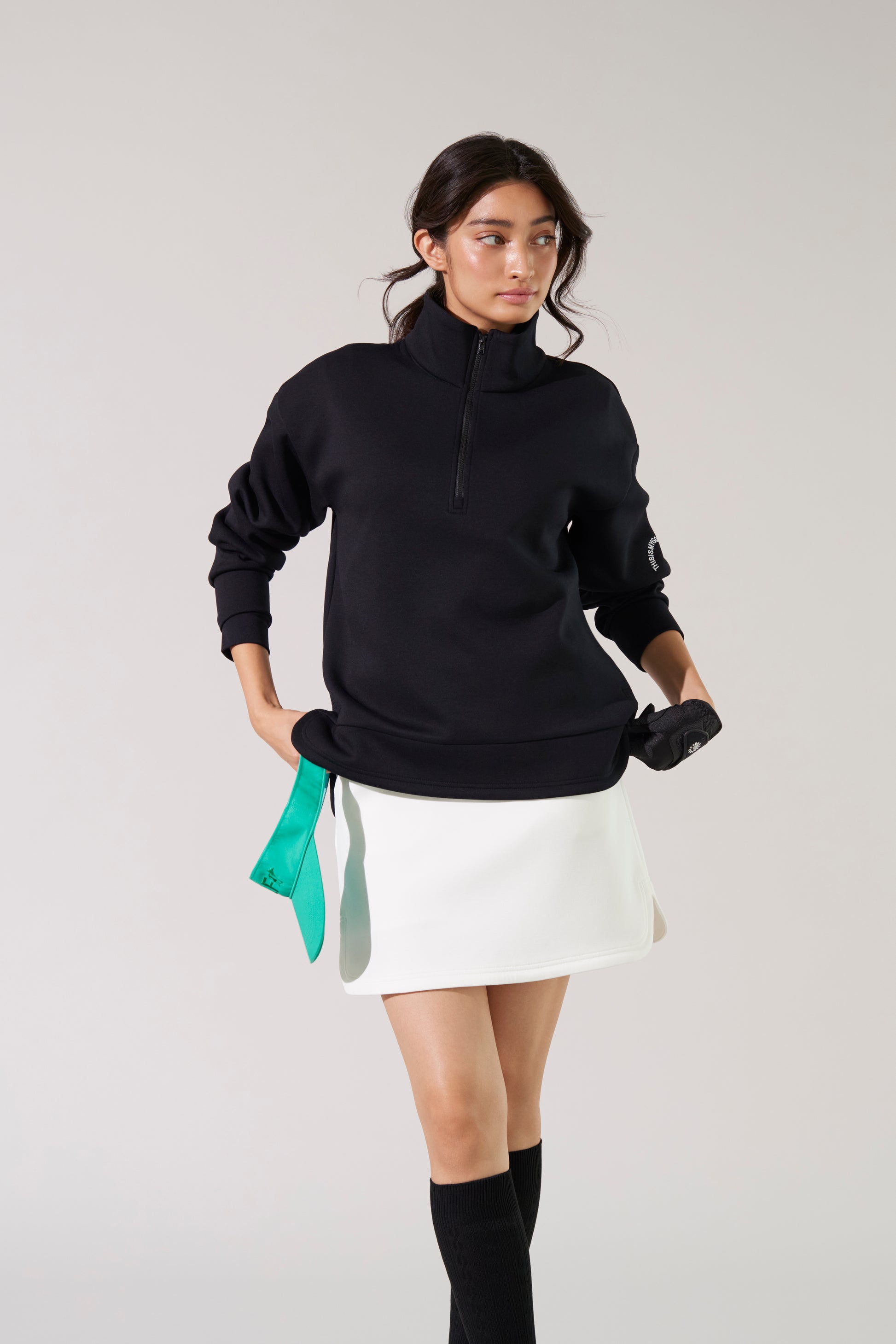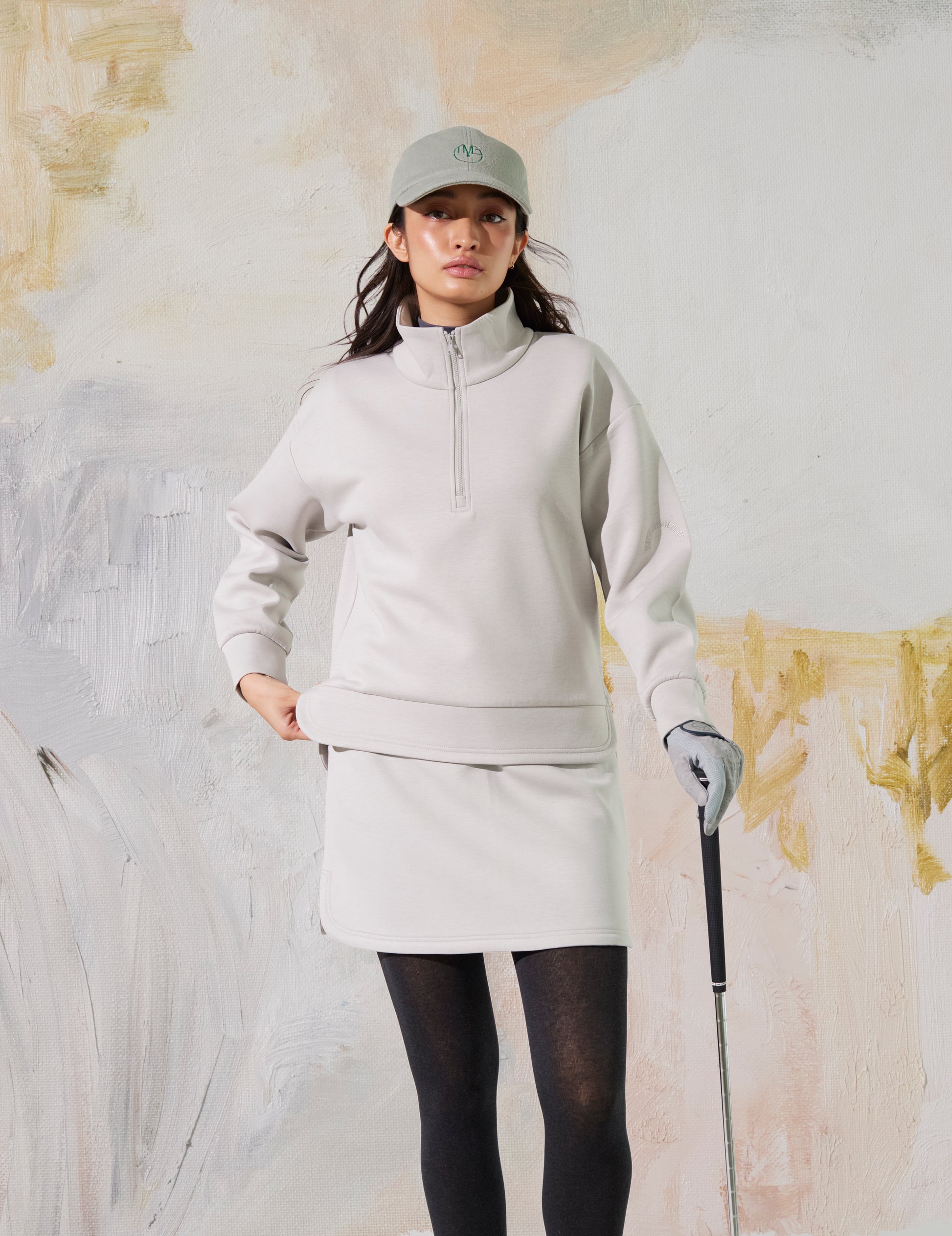 シンプル&クールに心地よく着られるジップアッププルオーバーの新作と、セットアップが叶うスカート。ヒップラインを拾わない、絶妙な台形シルエットです。両サイドのスリットと裾のステッチがポイントです。