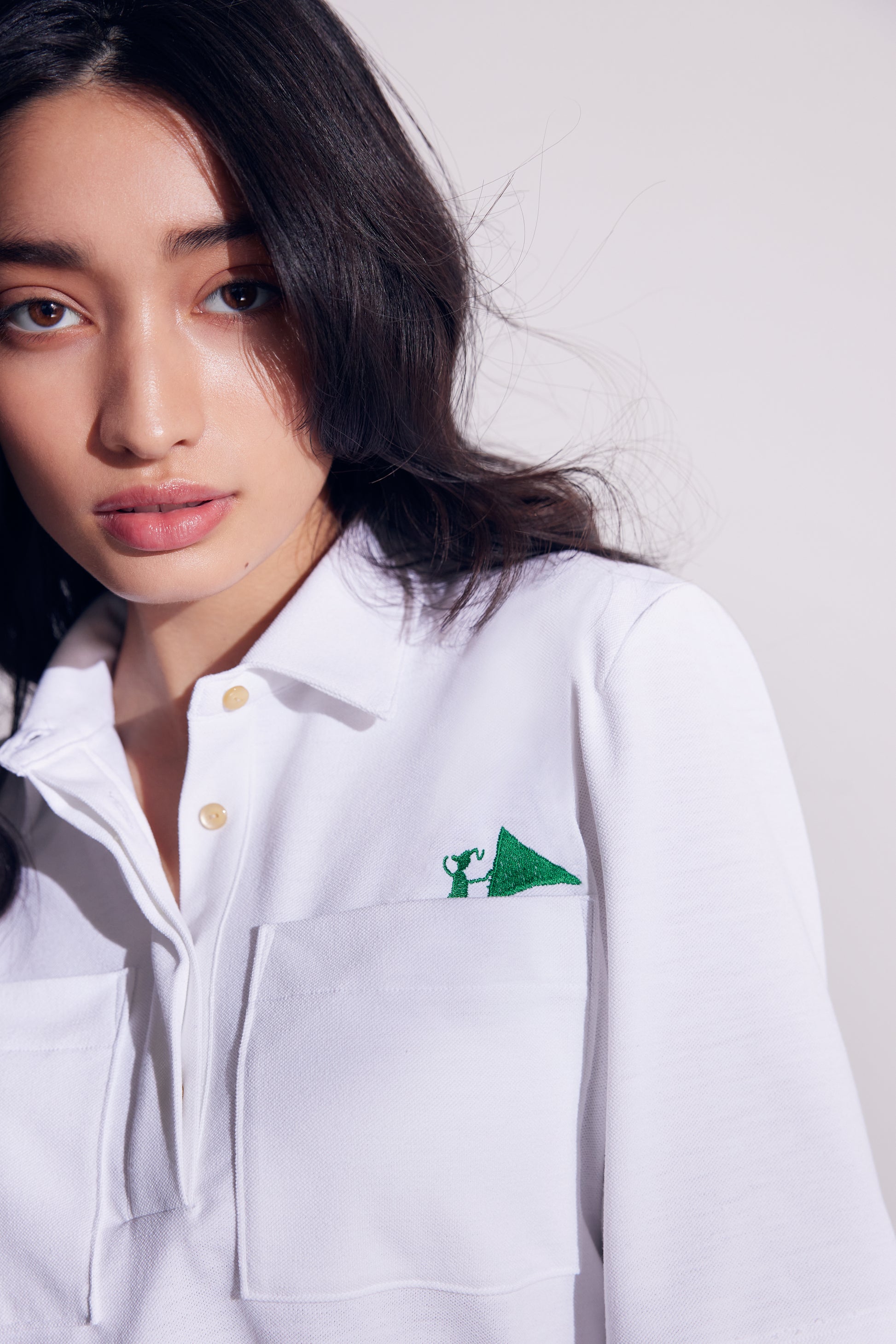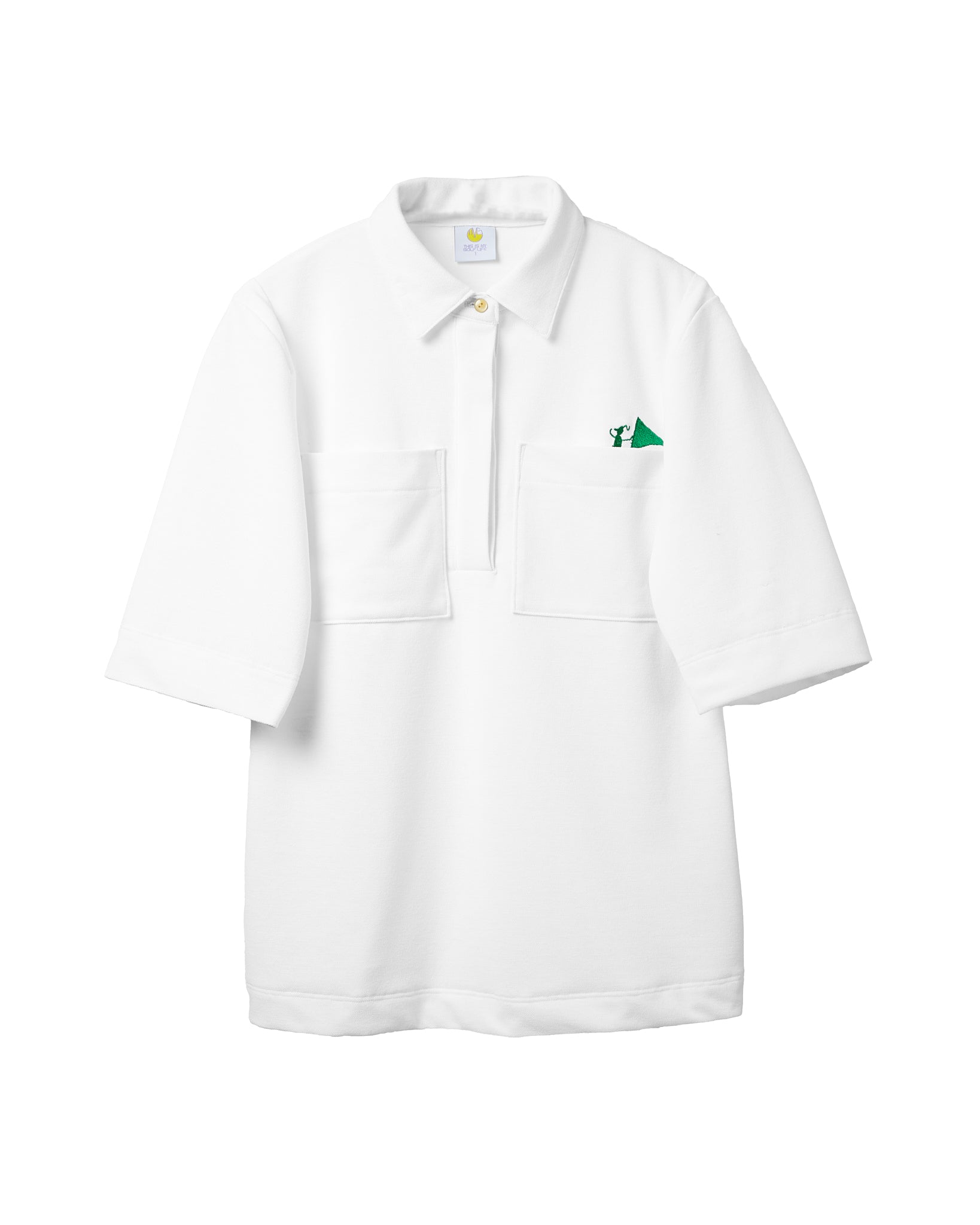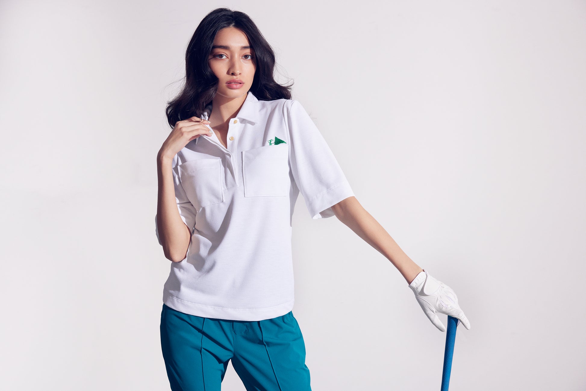 メンズライクなシャツながらも、ボリューム感のある五分袖と立体感のある襟がモードな、ハーフスリーブシャツ。 日焼け跡もつきにくく、気になる二の腕までカバーしてくれる五分袖丈は、優秀なスポーティーアイテム。 コットンライクでシワになりにくく、吸水速乾性も高い素材でプレー中の汗も気になりません。ポケットから覗くチラ見え”Golf Woman”の刺繍もポイント。